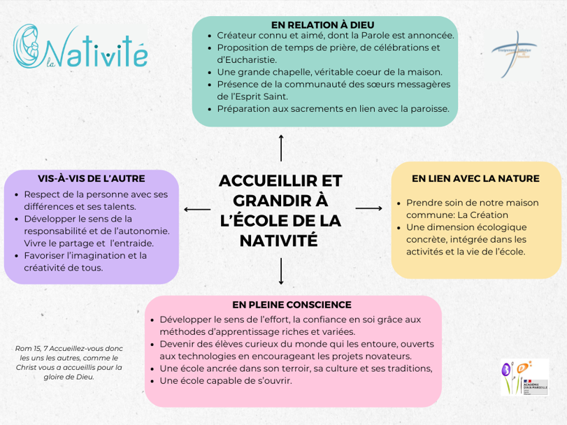 A la Nativité, chaque enfant est unique et mérite une éducation qui lui permette de s’épanouir pleinement. Depuis le XVIIIè siècle cet établissement a toujours eu une vocation à l’instruction. Etroitement liée à la présence des sœurs de la Nativité, aujourd’hui les sœurs messagères de l’Esprit Saint, Le port de l’uniforme dès le CP renforce la fraternité et le sentiment d’appartenance à la communauté éducative.