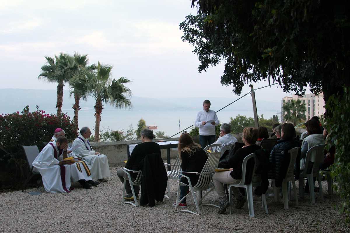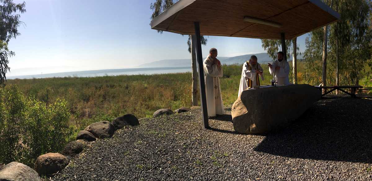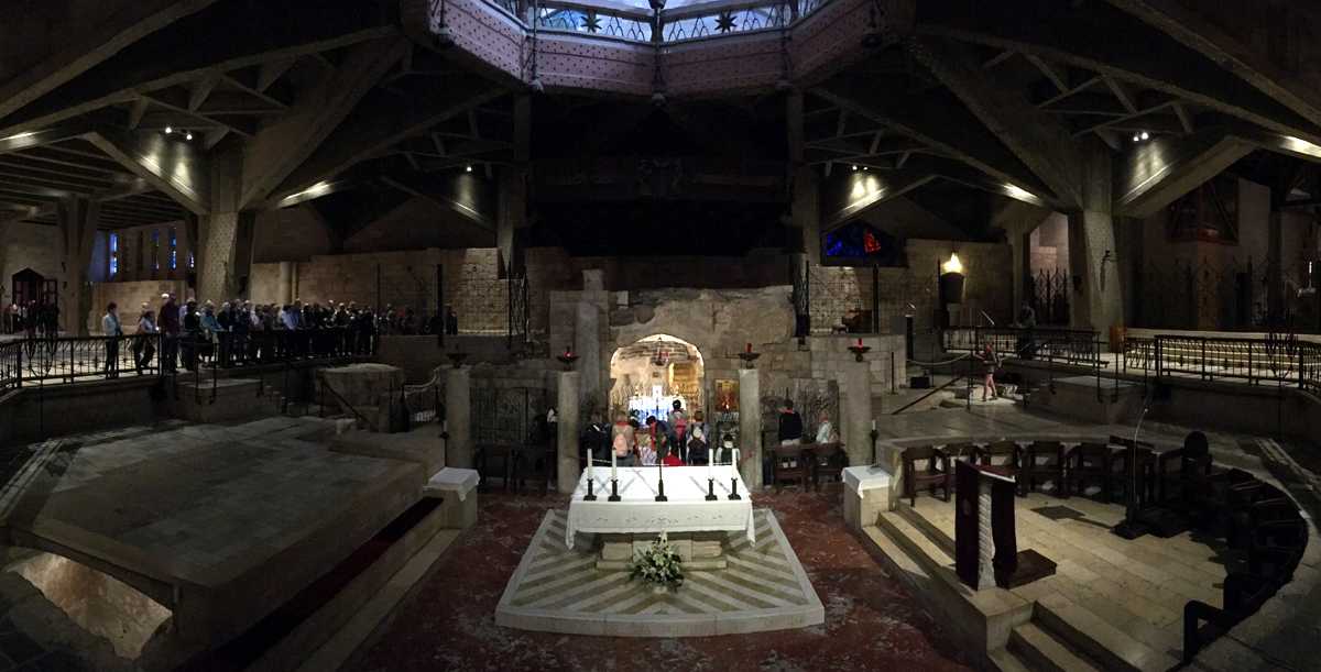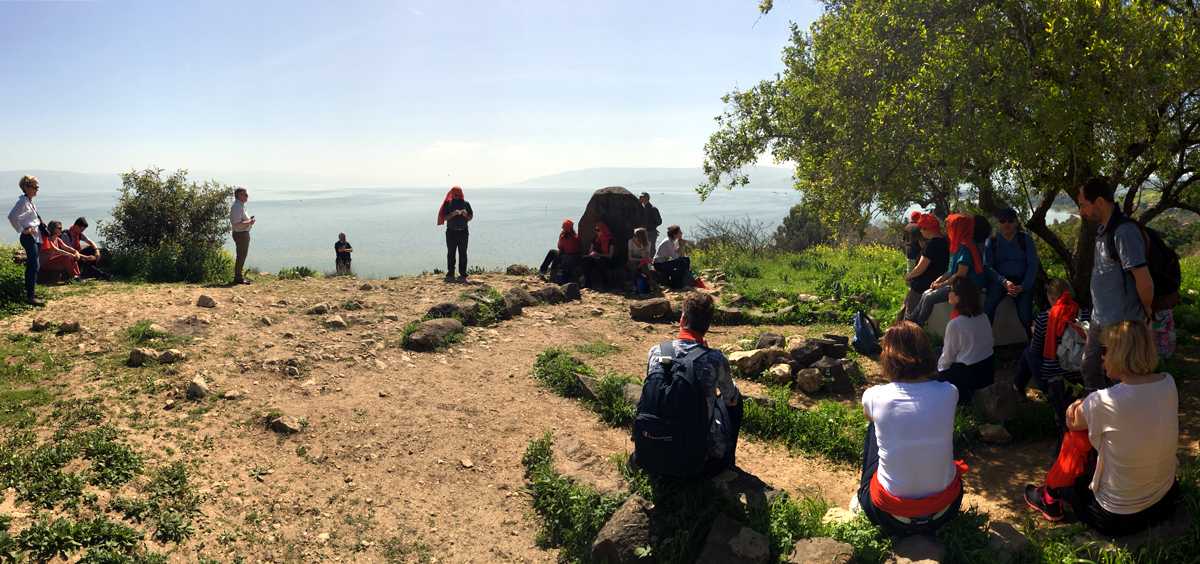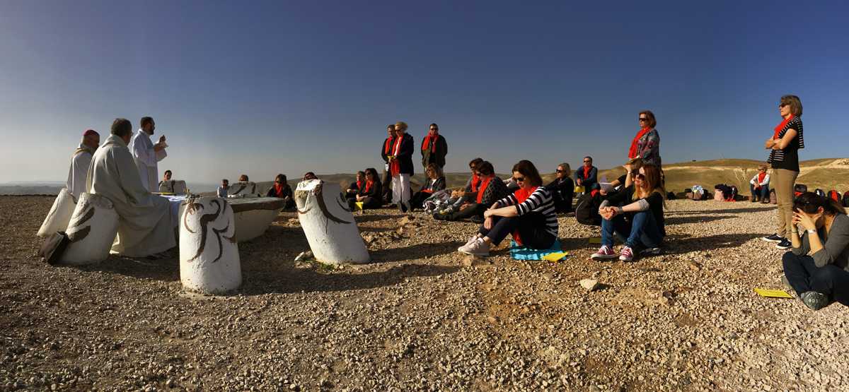 A présent, tout ce que nous avons vécu défile devant mes yeux et je retraverse mentalement les lieux habités le temps de huit jours : depuis Arad en passant par Ein-Gedi , Qûmran , à Qsar el Yahud, sur les bords du Jourdain où, selon la tradition, Jésus a été baptisé, L’Oasis à Tibériade, maison d’Accueil de la Communauté de l’Emmanuel, cette poignante cérémonie pénitentielle avec confession des chefs d’établissement-pèlerins ; la Primauté de Pierre » à Tabgha ; le site de la multiplication des pains à Dalmanutha ; le Mont des Béatitudes, Capharnaüm, le port de pêche d’André et de son frère Pierre, où Jésus s’installa : la Domus Galilae l’un des grands lieux du Chemin néo-cathéchuména; ; Nazareth, la ville de Marie et de Joseph, la basilique de l’Annonciation, « Verbo carum hic factum est »… le Parc national d’Arbel où se trouvent les « cornes de Hatin » la traversée de la Galilée, le Wadi Quelt, dans le désert de Jude ; Bethléem, la basilique de la Nativité, et puis Jérusalem : le Mont des Oliviers, Gethsémani, le Chemin de Croix, chemin de foi, du bienheureux Père Marie-Eugène à travers le souk vers la Basilique du Saint Sépulcre et enfin messe de Pâques dans la Basilique à quelques mètres du tombeau du Christ. Dernière étape : « l’Emmaüs des Croisés » lieu de la rencontre avec les disciples d’Emmaüs …